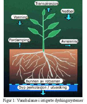 Vannbalansen i et jord/plante-system påvirkes av prosesser som tilfører vann (nedbør og vanning) og prosesser som forbruker vann (plantenes transpirasjon, fordamping fra jorda, avrenning på jordoverflata og utvasking til dypere jordlag som gjør vannet uttilgjengelig for plantene), som illustrert i figur 1.
