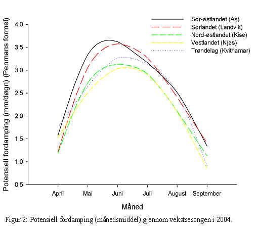 Figur 2 illustrerer variasjonen i potensiell fordamping (fordamping fra jord og transpirasjon i kortklipt vegetasjonsdekke) gjennom vekstsesongen.