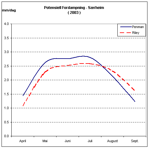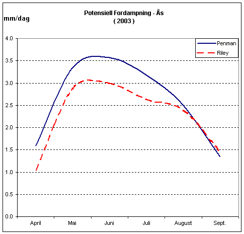 Studier har vist at numeriske metoder som Riley, gir noe lavere potensiell fordampning enn Penman, og har en markert sesongvariasjon. Riley viser lavere verdier på våren og relativt høyere verdier på sensommeren, se kurver for Ås (Akershus) og Særheim (Jæren) under.